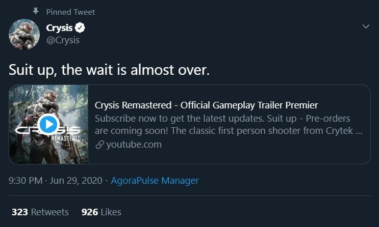 Crysis Remastered will get its first gameplay trailer in next few hours. The official Twitter handle of the game announced the news in a tweet recently.