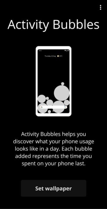 Developed by Google Creative Labs, Activity Bubbles is a Digital wellbeing app. Here each unlock creates a bubble that sets at the bottom of your screen. The more you unlock the phone the screen gets piled up bubbles. The size of the bubbles differs with the amount of usage before the phone was locked. The bubbles are dynamic and get displaced with the impact with the next bubble.