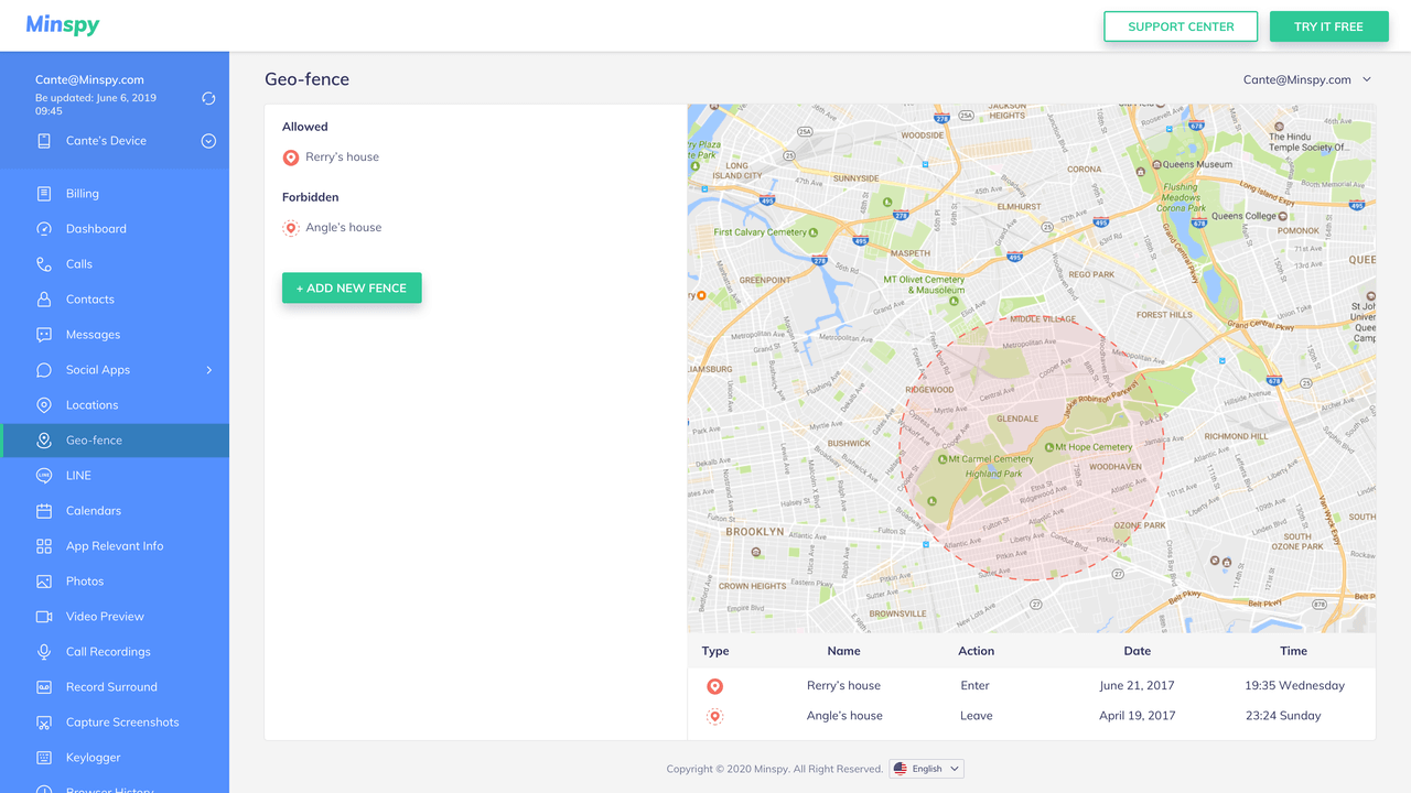 The exciting part is that you can set up restrictions on areas that your child should be. That’s the work of the Geofencing feature in Minspy. It allows you to set perimeters on areas that your child should go or not go. You will also input an email address for the alerts.